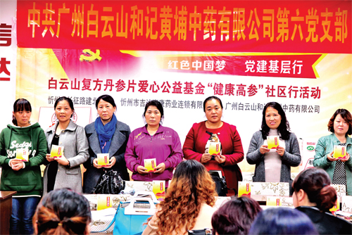 本報訊 10月21日,白云山和黃中藥公司復方丹參片愛心公益基金志愿者服務(wù)隊與忻州市吉達惠康連鎖藥店聯(lián)合主辦了“紅色中國夢、黨建基層行”愛心公益活動,向社區(qū)居民贈送了健康體檢卡及健康藥物禮包,并開展了一系列的黨建文化交流活動。