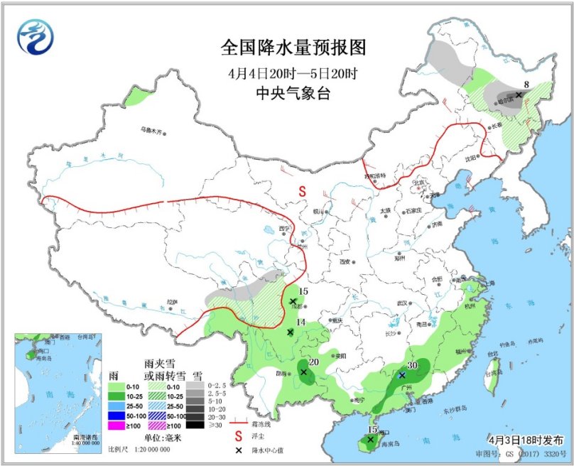 4月4日20時(shí)至5日20時(shí),黑龍江中南部、吉林東北部、內(nèi)蒙古東北部、西藏東部、川西高原中北部等地的部分地區(qū)有小到中雨或雨夾雪,其中黑龍江中部局地有大雪。江西南部、湖南南部、廣東北部和西部、海南島大部、云南東部等地的部分地區(qū)有中雨,局地大雨。內(nèi)蒙古西部、寧夏北部、陜西北部等地的部分地區(qū)有揚(yáng)沙或浮塵天氣。西北地區(qū)東北部、華北北部、東北地區(qū)南部有4~6級(jí)風(fēng)。