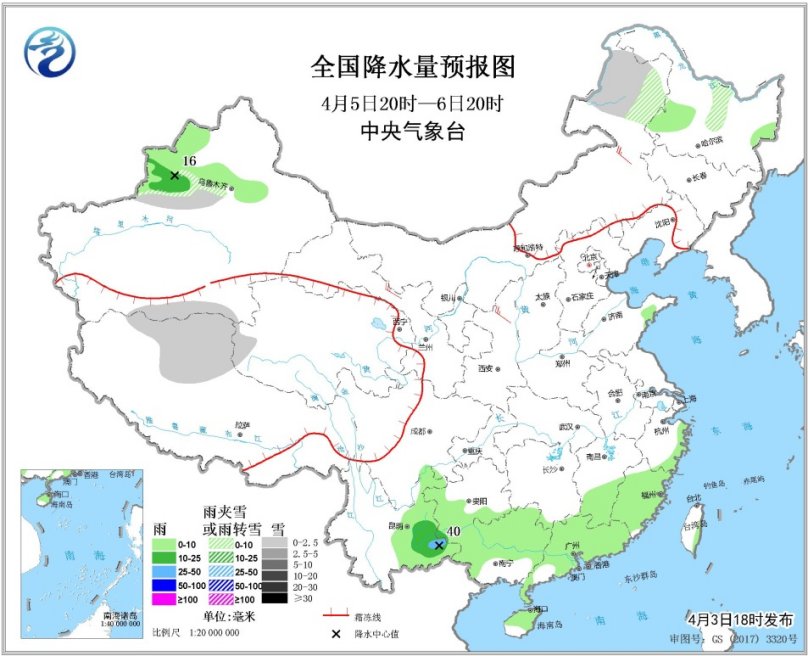 4月5日20時(shí)至6日20時(shí),內(nèi)蒙古東北部、新疆天山西部、西藏北部等地的部分地區(qū)有小雪或雨夾雪。新疆伊犁河谷和天山地區(qū)北部、江南東南部、華南、云南東部、貴州西部和南部等地有小雨,其中,新疆伊犁河谷、云南東南部等地部分地區(qū)有中雨,局地大雨。西北地區(qū)中東部、華北北部等地的部分地區(qū)有4~6級(jí)風(fēng)。