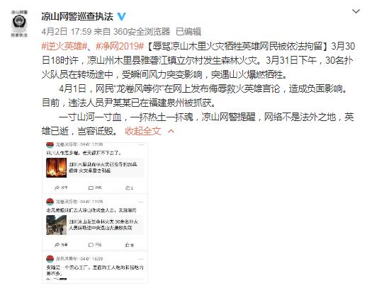 人民網(wǎng)北京4月3日電(記者孝金波 實(shí)習(xí)生張琳)3月30日18時許,涼山州木里縣雅礱江鎮(zhèn)立爾村發(fā)生森林火災(zāi),30名撲火隊(duì)員在轉(zhuǎn)場途中,突遇山火爆燃犧牲。悲痛之際,有網(wǎng)民舉報(bào)“一名叫‘龍卷風(fēng)等你’的賬戶竟在轉(zhuǎn)發(fā)撲火人員犧牲的消息時發(fā)布侮辱言論”,4月2日晚,涼山網(wǎng)警通告稱,發(fā)布侮辱言論的尹某某已在福建泉州被抓獲。