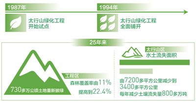 1987年,以改善生態(tài)、富山保川為目的,以加速綠化太行為重點(diǎn)的太行山綠化工程開(kāi)始在40個(gè)縣試點(diǎn)。