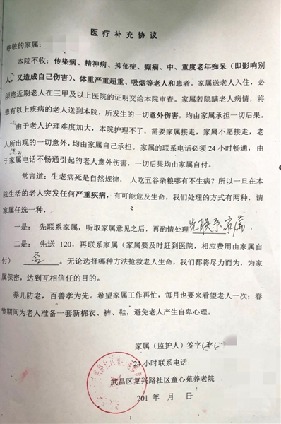 接收老人前,童心苑要求老人家屬簽訂的醫(yī)療補(bǔ)充協(xié)議。