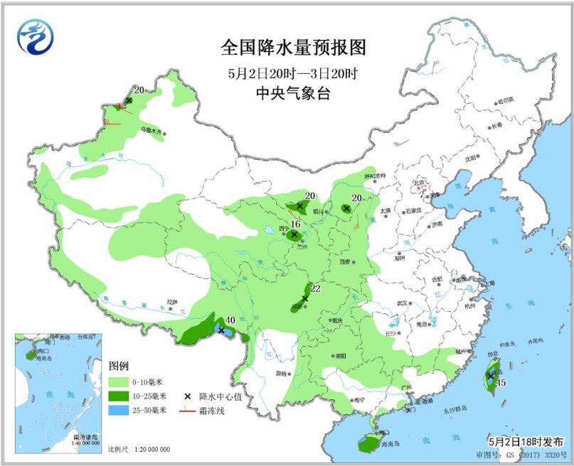 全國降水量預(yù)報(bào)圖(5月2日20時(shí)-3日20時(shí)) 5月3日20時(shí)至4日20時(shí),新疆北部、西藏東部和南部、西北地區(qū)中東部、西南地區(qū)東部和南部、華北大部、黃淮西部、江南中西部、華南中西部、臺(tái)灣島等地的部分地區(qū)有小到中雨,其中,西藏東南部、廣西北部等地的部分地區(qū)有大雨(25~45毫米)。新疆南疆盆地和沿天山地區(qū)、內(nèi)蒙古、甘肅河西等地的部分地區(qū)有4~6級(jí)風(fēng),新疆南疆盆地和內(nèi)蒙古西部有揚(yáng)沙或浮塵天氣。南海東北部部分海域風(fēng)力可達(dá)8級(jí)、陣風(fēng)9級(jí)。