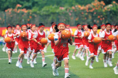 學生在運動會上展示集體籃球操