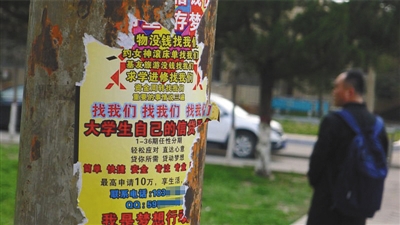 張貼在鄭州一大學校園內的校園網(wǎng)貸廣告。新京報記者 曹曉波 攝