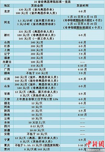 28省份高溫津貼標(biāo)準(zhǔn)一覽表 張尼制 28省份明確高溫津貼發(fā)放標(biāo)準(zhǔn) 部分地區(qū)上調(diào) 根據(jù)2012年修訂的《防暑降溫措施管理辦法》規(guī)定,用人單位安排勞動(dòng)者在35℃以上高溫天氣從事室外露天作業(yè)以及不能采取有效措施將工作場(chǎng)所溫度降低到33℃以下的,應(yīng)當(dāng)向勞動(dòng)者發(fā)放高溫津貼。 據(jù)中新網(wǎng)(微信公眾號(hào):cns2012)記者不完全統(tǒng)計(jì),目前全國(guó)已經(jīng)有28個(gè)省份明確了本地區(qū)的高溫津貼發(fā)放標(biāo)準(zhǔn)。而其中山東、陜西等地都是在去年上調(diào)了津貼標(biāo)準(zhǔn)。 例如,去年,山東省將從事室外作業(yè)和高溫作業(yè)人員的津貼從每人每月由120元漲至200元;非高溫作業(yè)人員每人每月80元漲至140元。這也是該省自2006年以來(lái)首次上調(diào)這一標(biāo)準(zhǔn)。陜西省的高溫津貼標(biāo)準(zhǔn)由原來(lái)的每人每天10元提高到25元。 另外,河北省也在去年制定了夏季高溫津貼試行標(biāo)準(zhǔn)。根據(jù)該標(biāo)準(zhǔn),從事室外露天作業(yè)的勞動(dòng)者每人每小時(shí)(含加班加點(diǎn))1.5元;沒(méi)有防暑降溫設(shè)備或有防暑降溫設(shè)備但達(dá)不到降低工作場(chǎng)所溫度效果的室內(nèi)勞動(dòng)者每人每小時(shí)(含加班加點(diǎn))1元。 從高溫津貼發(fā)放時(shí)間來(lái)看,各地也因氣候條件差異有所區(qū)別。如,北京、山西等北方地區(qū)的發(fā)放時(shí)間段為6到8月,而海南省的發(fā)放時(shí)間長(zhǎng)達(dá)7個(gè)月,為4到10月。 河北省因南北跨度長(zhǎng),氣溫差別大等原因,實(shí)行夏季高溫津貼差別時(shí)長(zhǎng)。其中,冬季取暖期標(biāo)準(zhǔn)不超過(guò)4個(gè)月(含4個(gè)月)的市、區(qū)、縣(市),每年從5月21日至8月31日?qǐng)?zhí)行;冬季取暖期標(biāo)準(zhǔn)超過(guò)4個(gè)月(不含4個(gè)月)的市、區(qū)、縣(市),每年從6月11日至8月20日?qǐng)?zhí)行。 多地標(biāo)準(zhǔn)數(shù)年未變 專(zhuān)家呼吁建立科學(xué)調(diào)整機(jī)制 按照《防暑降溫措施管理辦法》規(guī)定,高溫津貼標(biāo)準(zhǔn)由省級(jí)人力資源社會(huì)保障行政部門(mén)會(huì)同有關(guān)部門(mén)制定,并根據(jù)社會(huì)經(jīng)濟(jì)發(fā)展?fàn)顩r適時(shí)調(diào)整。 記者統(tǒng)計(jì)發(fā)現(xiàn),在已經(jīng)明確高溫津貼標(biāo)準(zhǔn)的省份中,部分地區(qū)的標(biāo)準(zhǔn)已經(jīng)多年未漲。 例如,廣東目前的高溫津貼標(biāo)準(zhǔn)為每人每月150元,這一標(biāo)準(zhǔn)從2007年開(kāi)始至今都未調(diào)整;河南省的高溫津貼標(biāo)準(zhǔn)為每人每工作日10元,這一標(biāo)準(zhǔn)也是2008年就已制定的。 而與其他省份不同,目前,天津高溫津貼已經(jīng)實(shí)行動(dòng)態(tài)調(diào)整,日標(biāo)準(zhǔn)按照上年度全市職工日平均工資12%發(fā)放。 “根據(jù)現(xiàn)在的物價(jià)水平,每個(gè)月一兩百元的高溫津貼標(biāo)準(zhǔn)還是少了些?!北本┠绸{校教練王師傅接受記者采訪時(shí)表示。 王師傅說(shuō),因?yàn)閷儆谑彝飧邷刈鳂I(yè),6到8月期間,他每月可以領(lǐng)到200元高溫津貼。雖然這一水平已經(jīng)高出了北京市規(guī)定的高溫津貼標(biāo)準(zhǔn),但是王師傅認(rèn)為,相較于近年來(lái)的工資、物價(jià)上漲情況,補(bǔ)貼并不算高。 “高溫津貼是崗位津貼,是一種勞動(dòng)補(bǔ)償,其調(diào)整還是應(yīng)該與工資掛鉤?!比松绮縿趧?dòng)科學(xué)研究所所長(zhǎng)鄭東亮接受中新網(wǎng)記者采訪時(shí)分析稱(chēng)。 鄭東亮表示,近些年已經(jīng)有不少地區(qū)對(duì)津貼標(biāo)準(zhǔn)進(jìn)行了調(diào)整,而未來(lái)地方政府有關(guān)部門(mén)要建立并完善一套科學(xué)合理的調(diào)整機(jī)制,并進(jìn)行細(xì)化。 “怎么調(diào)?調(diào)多少?這些問(wèn)題都應(yīng)當(dāng)認(rèn)真研究,高溫津貼不應(yīng)是想起來(lái)就調(diào),想不起來(lái)就不調(diào)?!编崠|亮說(shuō)。 全國(guó)開(kāi)展專(zhuān)項(xiàng)檢查 高溫津貼不能成“紙上權(quán)益” 近年來(lái),人社部、中華全國(guó)總工會(huì)等部門(mén)都曾多次強(qiáng)調(diào),用人單位要按規(guī)定發(fā)放高溫津貼,且防暑降溫飲料不得充抵高溫津貼。此外,不少地區(qū)也出臺(tái)了相應(yīng)的監(jiān)督、懲罰措施。 例如,《廣東省高溫天氣勞動(dòng)保護(hù)辦法》中就明確,未向勞動(dòng)者發(fā)放高溫津貼的,由縣級(jí)以上人力資源社會(huì)保障主管部門(mén)責(zé)令限期改正,給予補(bǔ)發(fā);逾期未改正的,處2000元以上10000元以下罰款。 即便如此,在一些地方或者一些單位,高溫津貼仍然不能及時(shí)發(fā)放。例如,近期就有媒體報(bào)道,有建筑工地工人三年未收到過(guò)高溫津貼。 而中新網(wǎng)記者在北京地區(qū)走訪發(fā)現(xiàn),雖然不少像快遞員、環(huán)衛(wèi)工這樣的室外高溫作業(yè)人員表示,近年來(lái)有收到高溫津貼,但很多人對(duì)于高溫津貼發(fā)放的具體標(biāo)準(zhǔn)并不清楚。 “我自己不知道北京市的高溫津貼到底是什么標(biāo)準(zhǔn),應(yīng)該發(fā)多少?什么時(shí)候發(fā)?這些不太了解?!焙5韰^(qū)一名環(huán)衛(wèi)工這樣告訴中新網(wǎng)記者。 對(du