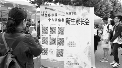 9月1日,中央財經大學新生報到現(xiàn)場,金融學院的學生邀請新生掃碼入群。李涓 攝