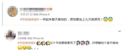 自2015年2月至今,新浪微博“#節(jié)后綜合癥#”的話題主頁持續(xù)有新帖發(fā)布,總閱讀量超過1000萬。節(jié)后第一天尚未到來,已經(jīng)有網(wǎng)友發(fā)帖抱怨“一早起來暈天暈地的”“好想睡他個昏天暗地”。