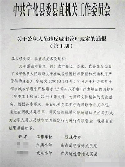 爭(zhēng)議由一份通報(bào)文件開(kāi)始。網(wǎng)傳圖片顯示,一份抬頭為“中共寧化縣委縣直機(jī)關(guān)工作委員會(huì)”的《關(guān)于公職人員違反城市管理規(guī)定的通報(bào)》中,寧化縣針對(duì)公職人員違反城市管理規(guī)定行為進(jìn)行專項(xiàng)督查,并對(duì)部分公職人員進(jìn)行了公開(kāi)通報(bào)。其中,文件第一頁(yè)列明,兩名工作單位分別為紅旗小學(xué)和城東小學(xué)的教師,因?yàn)椤霸谡嫉澜?jīng)營(yíng)攤點(diǎn)買菜”的違規(guī)行為,受到通報(bào)處理。