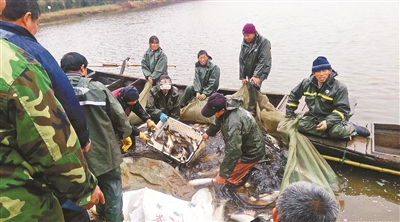 武漢科技大學聘請的專業(yè)捕撈隊將漁網(wǎng)收到岸邊