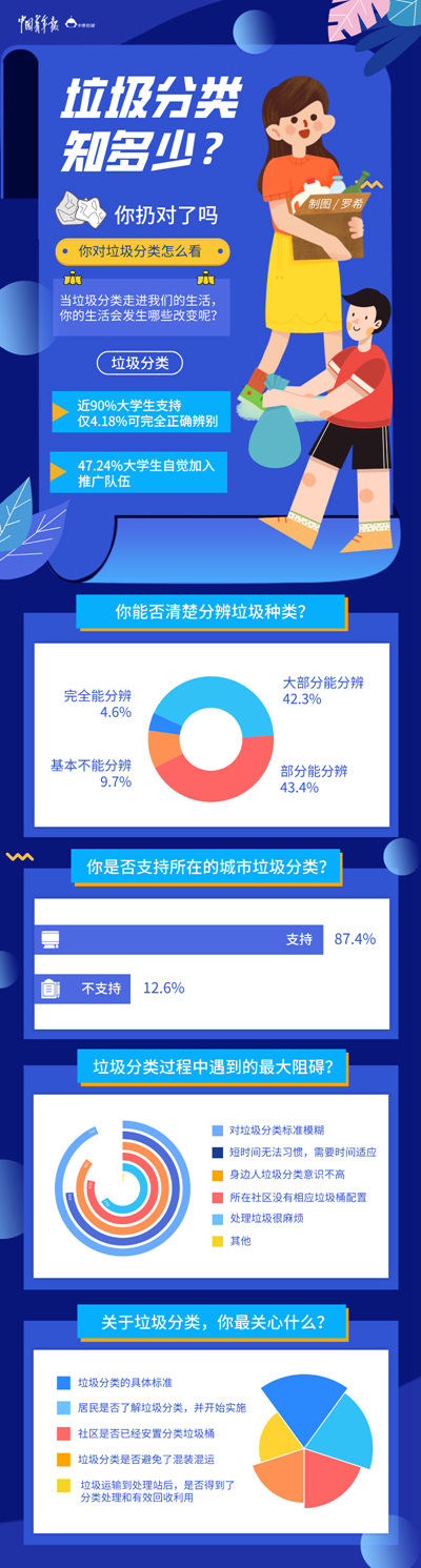 近日,中青校媒面向全國900名大學生發(fā)起問卷調(diào)查。調(diào)查結果顯示,87.4%的大學生支持垃圾分類,希望所在城市實施垃圾分類措施。
