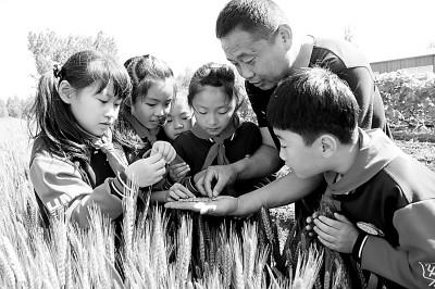2021年5月21日,山東省高密市豪邁小學(xué)師生來到麥田“寫作業(yè)”,他們?cè)谵r(nóng)民伯伯的指導(dǎo)下零距離觀察小麥,學(xué)習(xí)“小滿”節(jié)氣的農(nóng)耕常識(shí)。光明圖片