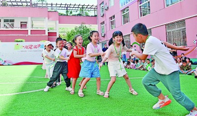 浙江仙居縣第一小學內,一年級新生們正在玩老鷹捉小雞游戲。王華斌攝/光明圖片