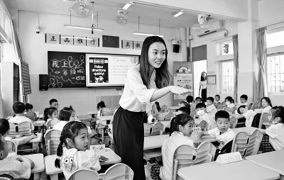在廣東深圳市福田區(qū)南園小學(xué),教師黃曉蕾在英語課上與孩子們互動。新華社發(fā)
