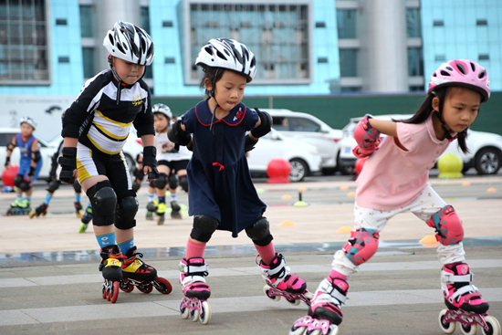 在連云港市連云區(qū)一家輪滑培訓(xùn)班,小朋友正在進(jìn)行輪滑訓(xùn)練。視覺(jué)中國(guó)供圖
