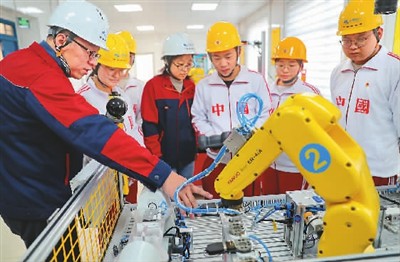 河北建材職業(yè)技術(shù)學(xué)院教師指導(dǎo)學(xué)生進(jìn)行工業(yè)機(jī)器人操作與運(yùn)維1+X職業(yè)等級(jí)證書的實(shí)操訓(xùn)練。(曹建雄攝 人民視覺(jué))