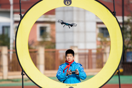 2021年12月14日,浙江省湖州市長(zhǎng)興縣第一小學(xué)的學(xué)生操作無(wú)人機(jī)進(jìn)行穿越訓(xùn)練。 視覺(jué)中國(guó)供圖(資料圖片)
