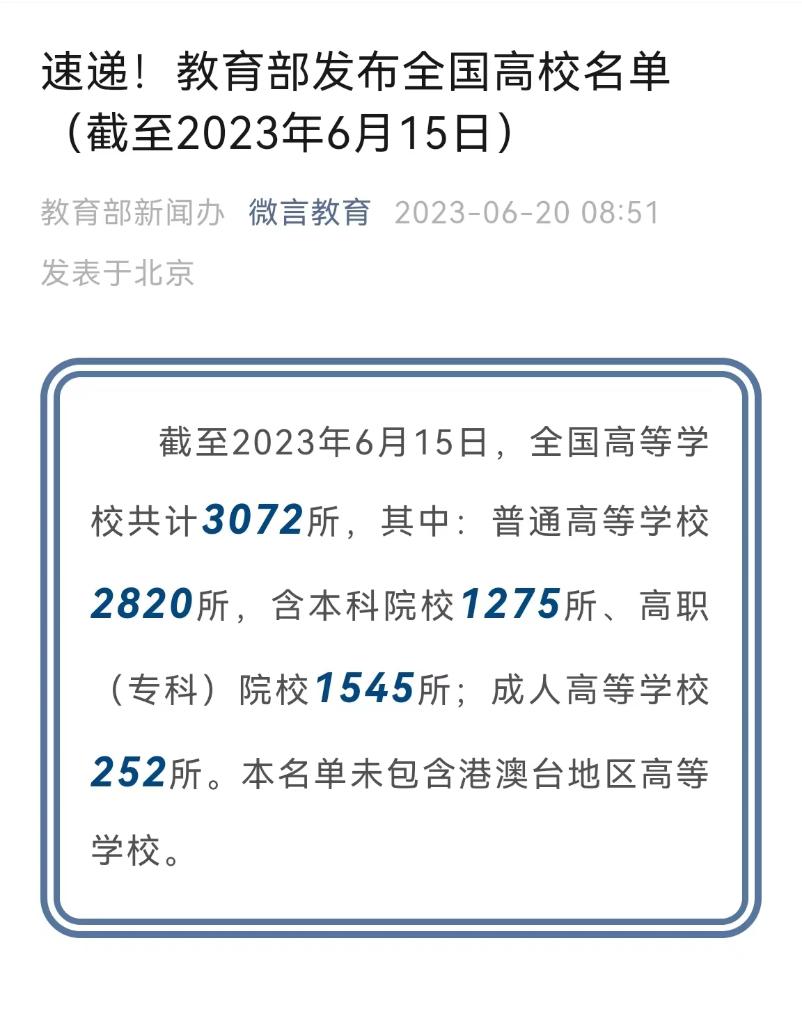 記者6月20日從教育部獲悉,根據(jù)近日發(fā)布的全國高校名單,截至2023年6月15日,全國高等學校共計3072所,其中普通高等學校2820所,含本科院校1275所、高職(??疲┰盒?545所;成人高等學校252所。