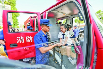 最近,各地學(xué)校陸續(xù)開啟新學(xué)期。圖為8月31日,在四川省眉山市彭山區(qū)學(xué)院路幼兒園,眉山市彭山區(qū)消防救援大隊(duì)的消防員為小朋友們介紹消防車上的裝備。新華社記者 王曦?cái)z