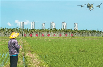 7月6日,海南省瓊海市嘉積鎮(zhèn)農(nóng)民在利用無人機(jī)噴灑農(nóng)藥。蒙鐘德攝(人民視覺)