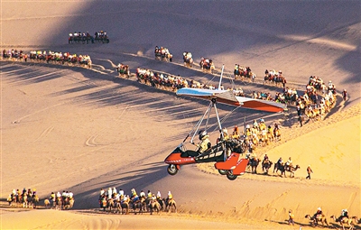 近年來,在甘肅省敦煌市鳴沙山月牙泉景區(qū)運(yùn)營(yíng)的敦煌“飛天”通用航空項(xiàng)目,為游客提供低空飛行器旅游服務(wù),讓游客乘坐直升機(jī)、動(dòng)力滑翔機(jī),從空中欣賞大漠綠洲和月牙泉美景,沉浸式體驗(yàn)敦煌獨(dú)特魅力。圖為7月3日,游客乘坐滑翔機(jī)空中俯瞰敦煌大漠風(fēng)光。王斌銀攝(人民視覺)