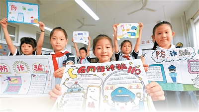 河北省邯鄲市復(fù)興區(qū)陽春小學(xué)的學(xué)生們展示網(wǎng)絡(luò)安全主題手抄報。郝群英攝(人民視覺)