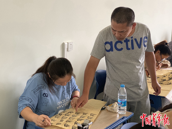 蔡偉在書法課上指導(dǎo)學(xué)生。