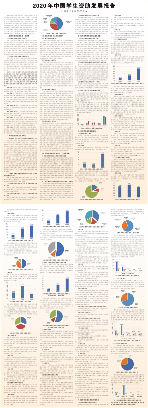 學(xué)生資助事關(guān)民生,連著民心。做好學(xué)生資助工作,是促進(jìn)教育公平和社會(huì)公平的必然要求,是建設(shè)人力資源強(qiáng)國的迫切需要,是加快推進(jìn)教育現(xiàn)代化的重要基礎(chǔ)。2020年,在習(xí)近平新時(shí)代中國特色社會(huì)主義思想指引下,各級(jí)教育、財(cái)政等部門和各級(jí)各類學(xué)校,堅(jiān)持以人民為中心,緊緊圍繞立德樹人根本任務(wù),進(jìn)一步完善學(xué)生資助政策,大力推進(jìn)精準(zhǔn)資助,持續(xù)加強(qiáng)規(guī)范管理,全面促進(jìn)資助育人,各項(xiàng)學(xué)生資助政策全面落實(shí),全年資助資金2408.20億元,資助學(xué)生14617.50萬人次,為抗擊疫情和應(yīng)對(duì)汛情影響作出了積極貢獻(xiàn),在助力打贏脫貧攻堅(jiān)戰(zhàn)中發(fā)揮了重要作用。