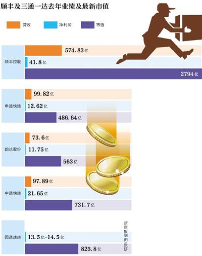 2016年度,順豐營業(yè)利潤36.93億元,同期增長44.20%;歸屬凈利潤為41.80億元,同期增長112.51%。報告期扣除非經(jīng)常性損益后歸屬于上市公司股東的凈利潤約為26.43億元。中通凈利潤21.65億元,同比增長76.8%;申通凈利潤為12.62億元,同比增長64.97%;韻達凈利潤11.75億元,同比增長120.63%;依據(jù)圓通1月底發(fā)布的2016年度業(yè)績修正預(yù)告,報告期內(nèi)圓通預(yù)計歸屬凈利潤為13.5億-14.5億元,同比增長88%至102%。