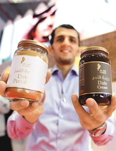 11月7日,第二屆進博會沙特阿拉伯國家館工作人員在展示產(chǎn)自沙特的果醬。新華社記者 陳 飛攝