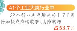 統(tǒng)計(jì)數(shù)據(jù)顯示,在41個(gè)工業(yè)大類行業(yè)中,有22個(gè)行業(yè)利潤增速較1至2月份加快或降幅收窄、由降轉(zhuǎn)增,占53.7%。