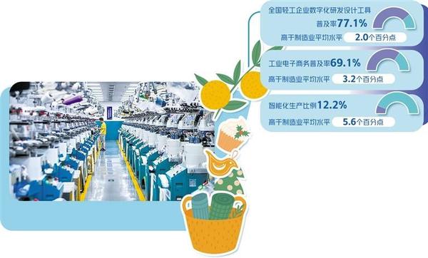 “以輕工業(yè)為例,全國輕工企業(yè)數(shù)字化研發(fā)設(shè)計工具普及率77.1%,工業(yè)電子商務(wù)普及率69.1%,分別高于制造業(yè)平均水平2.0個和3.2個百分點。”王孝洋說。