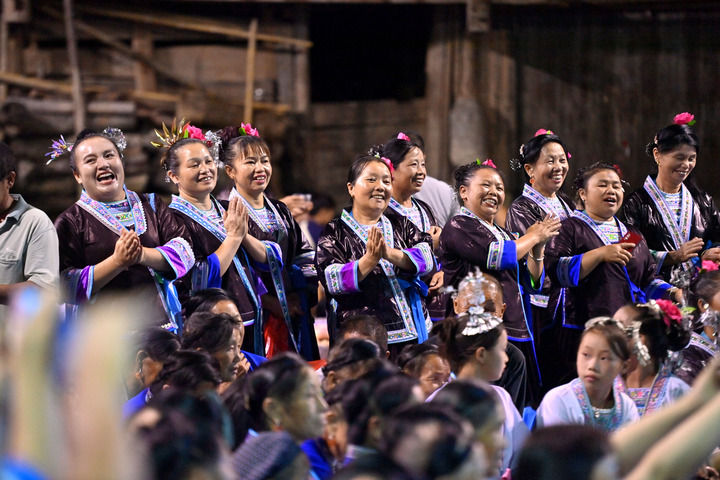在廣西融水苗族自治縣桿洞鄉(xiāng)堯告村,村民們?cè)谟^看文藝演出(2024年8月13日攝)。新華社記者 黃孝邦 攝