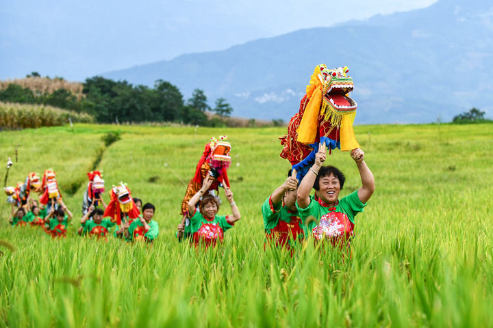 在云南省紅河哈尼族彝族自治州個(gè)舊市卡房鎮(zhèn)的旱地優(yōu)質(zhì)稻種植示范區(qū),群眾抬著板凳龍?jiān)谔镩g穿行迎接豐收季的到來(lái)(2024年9月20日攝)。新華社記者 王靜頤 攝