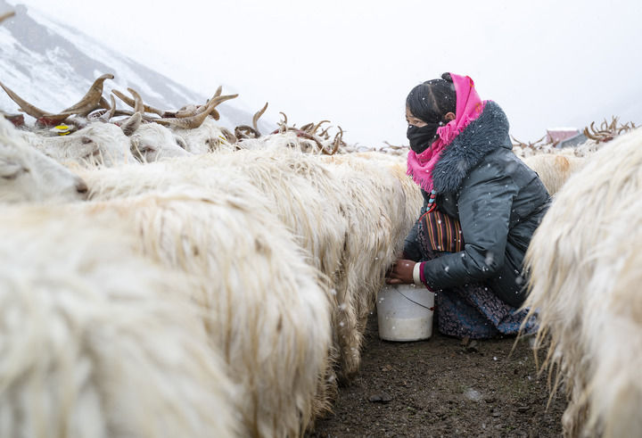 在西藏阿里地區(qū)日土縣龍門(mén)卡村白絨山羊擴(kuò)繁場(chǎng),飼養(yǎng)員在給白絨山羊擠奶(2024年9月13日攝)。新華社記者 孫瑞博 攝