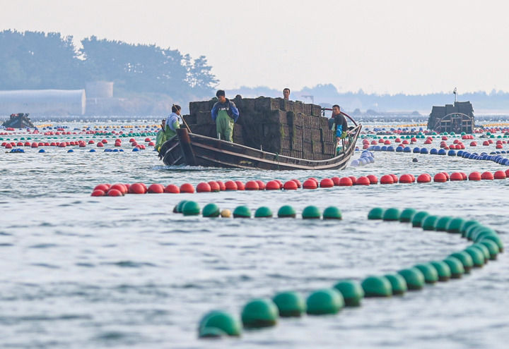 在山東省榮成市愛(ài)倫灣海域,鮑魚(yú)養(yǎng)殖戶(hù)駕駛滿(mǎn)載鮑魚(yú)的漁船返回(2024年9月11日攝)。新華社發(fā)(李信君攝)