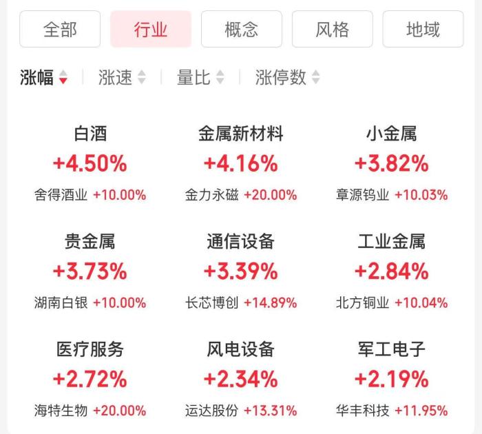 盤面上,白酒、金屬新材料、通信設(shè)備等行業(yè)板塊漲幅居前。概念板塊方面,稀土永磁概念大漲,帶動(dòng)金力永磁、中鋼天源、領(lǐng)益智造等相關(guān)個(gè)股漲停;另,F(xiàn)5G概念、金屬鉛等表現(xiàn)亮眼。