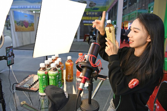 10月16日,在2020中國旅游產(chǎn)業(yè)博覽會上,主播通過直播推介美食。新華社發(fā)