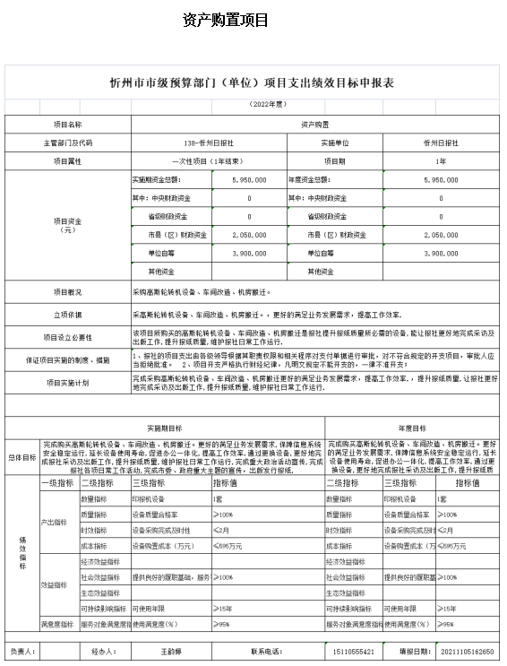 第三部分 2022年度部門預算情況說明 一、2022年度部門預算數(shù)據(jù)變動情況及原因 1、收入預算說明 忻州日報社2022年收入預算1056.56萬元,比2021年增加176.61萬元。 2、支出預算說明 基本支出726.16萬元,比2021年減少33.79萬元,基本支出系按現(xiàn)有人員工資標準和公共經(jīng)費定額標準核定,主要用于保障機關正常運轉(zhuǎn)、完成日常工作任務而發(fā)生的各項支出。其中:工資福利支出693.02萬元,對個人和家庭的補助支出9.26萬元,公用經(jīng)費項目23.88萬元。 項目支出330.4萬元,比2021年增加210.4萬元。主要為廣告收入專項經(jīng)費120萬元,主要用于辦公費、維修費、水電費、差旅費、采暖費、郵電費等日常開支。第一書記和駐村工作隊補助5.4萬元,主要用于下鄉(xiāng)工作隊補助費用。資產(chǎn)購置205萬元,主要用于購買報社印報所需的專用設備。 我單位不涉及政府性基金預算,2022年度政府性基金預算財政撥款本年收入0元,本年支出0元。 二、“三公”經(jīng)費增減變動原因說明 我單位是全額事業(yè)單位,財政只撥付人員經(jīng)費。從財政撥款中沒有支出“三公經(jīng)費”,“三公經(jīng)費”數(shù)字為0,故有關“三公經(jīng)費”的內(nèi)容均無。一般公共預算“三公”經(jīng)費支出表、“三公”經(jīng)費增減變化原因及因公出國、公務用車、公務接待等項均無數(shù)字。也沒有因公出國(境)團組數(shù)及人數(shù),“公務用車購置和運行費”為0。 三、機關運行經(jīng)費增減變動原因說明 本部門機關運行經(jīng)費未使用財政撥款,全部由部門自有資金支付。 四、政府采購情況 2022年我單位政府采購預算總額246萬元,其中:政府采購貨物預算246萬元、政府采購工程預算0萬元、政府采購服務預算0萬元。 五、績效管理情況 1、績效管理情況 2022年忻州日報社實行績效目標管理的項目3個,涉及一般公共預算當年撥款330.4萬元。 2、績效目標情況