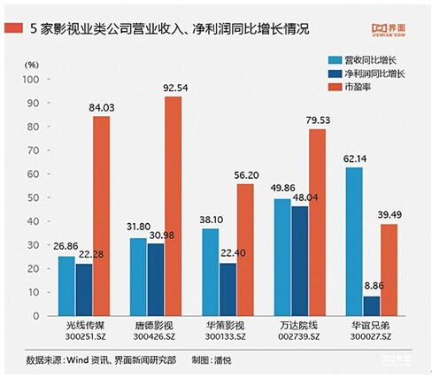 據(jù)界面報道,根據(jù)財報顯示,華誼兄弟2015年影視娛樂版塊營業(yè)收入較上年同期相比增135.80%,達(dá)到28.32億元,營業(yè)成本較上年同期增長135.80%,達(dá)到16.62億,毛利率較上年減少了3.05%,達(dá)到41.35%。在報告期內(nèi),公司上映的主要是《奔跑吧兄弟》《天將雄師》《梔子花開》、《命中注定》《尋龍訣》《老炮兒》等16部,電影的總票房約43億。