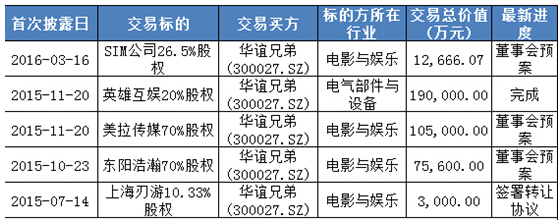據(jù)和訊股票報道,2015年10月22日,華誼兄弟以7.56億元收購浙江東陽浩瀚影視娛樂有限公司(以下稱“東陽浩瀚”)的藝人股東或藝人經(jīng)紀(jì)管理人合計持有的70%股權(quán)。主要經(jīng)營業(yè)務(wù)包括影視劇項目的投資、制作和發(fā)行,藝人衍生品業(yè)務(wù)的開發(fā)和經(jīng)營,而此次收購所涉及的藝人包括李晨、馮紹峰、Angelababy、鄭愷、杜淳、陳赫共6人。