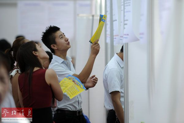 資料圖片:2014年6月15日,求職者在第四屆寧蒙陜甘(銀川)毗鄰城市區(qū)域合作大型人才智力交流大會現(xiàn)場觀看招聘信息。新華社記者李然攝。
