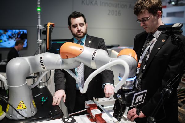 資料圖片:2016年4月27日,在德國(guó)漢諾威工業(yè)博覽會(huì)上,工作人員在德國(guó)庫卡機(jī)器人公司展區(qū)展示機(jī)器人手臂。新華社記者張帆攝