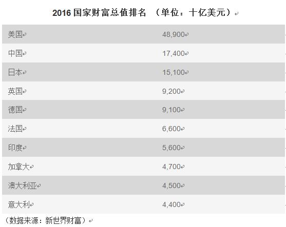 美國(guó)以48.9萬(wàn)億美元(約合人民幣327萬(wàn)億元)財(cái)富總值高居榜首,接下來(lái)依次是中國(guó)、日本、英國(guó)、德國(guó)、法國(guó)、印度、加拿大、澳大利亞和意大利。