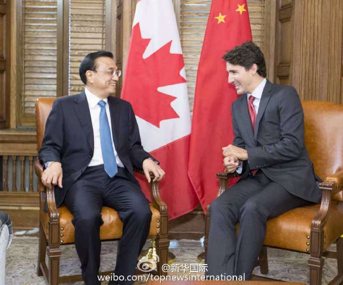 新華網(wǎng)北京9月23日電 當(dāng)?shù)貢r(shí)間22日,李克強(qiáng)總理與加拿大總理特魯多舉行會(huì)談,確認(rèn)正式啟動(dòng)中加總理年度對(duì)話機(jī)制。會(huì)談中,兩國(guó)總理就中加關(guān)系和共同關(guān)心的地區(qū)國(guó)際問(wèn)題進(jìn)行了廣泛深入的交談。這是李克強(qiáng)和特魯多在不到一個(gè)月時(shí)間里第二次會(huì)晤。特魯多本月初剛剛訪華。(據(jù)新華社“新華國(guó)際”微博報(bào)道)