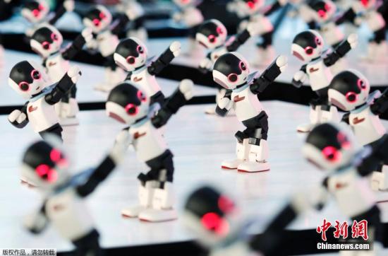 資料圖:當地時間2015年1月19日,日本東京,DIY機械展覽上100機器人大跳“廣場舞”,這批智能機器人高約34.5厘米,還能識別200個日文短語,走路、踢球更是不在話下。