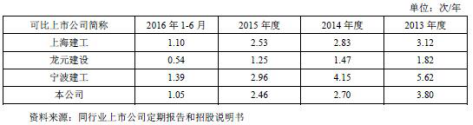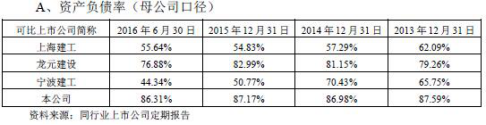 2013年至2016年6月,重慶建工資產(chǎn)負債率較高,分別為87.59%、86.98%、87.17%、86.31%,高于同行業(yè)上市公司。
