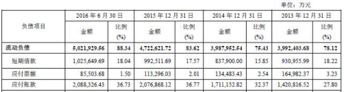 根據(jù)招股書,2013年至2016年6月,重慶建工負債合計5,110,662.36萬元、5,286,972.23萬元、5,647,761.37萬元、5,685,083.35萬元。其中,流動負債為3,992,403.68萬元、3,987,952.54萬元、4,722,621.72萬元、5,021,929.56萬元,占負債總額的78.12%、75.43%、83.62%、88.34%;非流動負債1,118,258.68萬元、1,299,019.6萬元、925,139.64萬元、663,153.80萬元,占負債總額的21.88%、24.57%、16.38%、11.66%。