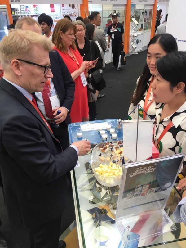 像索爾貝格之前的行為一樣,“中食展”活動(dòng)現(xiàn)場,芬蘭環(huán)境部部長基莫·蒂利凱(Kimmo Tiilikainen)也“親身示范”,品嘗起芬蘭食物。在接受澎湃新聞采訪時(shí),蒂利凱說道,對(duì)我們而言,中國是個(gè)極具吸引力的市場,我們有能滿足中國市場需求的食品門類,以及配套的電子商務(wù)服務(wù)措施。隨著中國人健康意識(shí)的增強(qiáng),我們也在有意識(shí)地面向中國市場開發(fā)銷售健康食品。