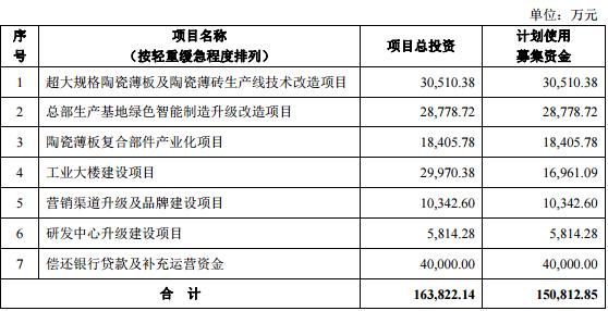 1.超大規(guī)格陶瓷薄板及陶瓷薄磚生產(chǎn)線技術(shù)改造項(xiàng)目,項(xiàng)目總投資30,510.38萬元,計(jì)劃使用募集資金30,510.38萬元;2.總部生產(chǎn)基地綠色智能制造升級(jí)改造項(xiàng)目,項(xiàng)目總投資28,778.72萬元,計(jì)劃使用募集資金28,778.72萬元;3.陶瓷薄板復(fù)合部件產(chǎn)業(yè)化項(xiàng)目,項(xiàng)目總投資18,405.78萬元,計(jì)劃使用募集資金18,405.78萬元;4.工業(yè)大樓建設(shè)項(xiàng)目,項(xiàng)目總投資29,970.38萬元,計(jì)劃使用募集資金16,961.09萬元;5.營銷渠道升級(jí)及品牌建設(shè)項(xiàng)目,項(xiàng)目總投資10,342.60萬元,計(jì)劃使用募集資金10,342.60萬元;6.研發(fā)中心升級(jí)建設(shè)項(xiàng)目,項(xiàng)目總投資5,814.28萬元,計(jì)劃使用募集資金5,814.28萬元;7.償還銀行貸款及補(bǔ)充運(yùn)營資金,項(xiàng)目總投資40,000.00萬元,計(jì)劃使用募集資金40,000.00萬元。